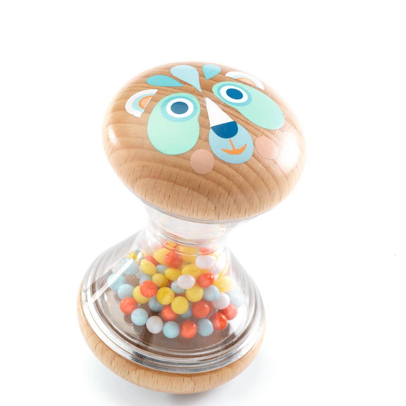 Un sonaglio in legno naturale decorato con un orsetto dai colori pastello, pensato per i bambini dai 3 mesi in su. Piccole biglie colorate da osservare e ascoltare. Il sonaglio rotola.