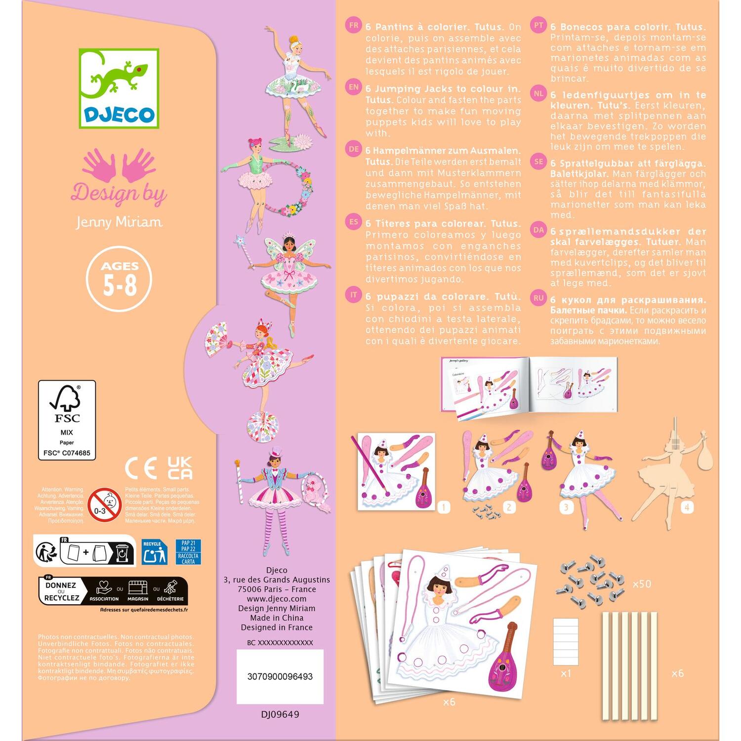 Una bustina con immagini da colorare e assemblare per realizzare 6 marionette. Il bambino colora e stacca i pezzi di cartone, poi li assembla per creare delle graziose marionette. Non resta che animarle e far danzare tutte queste signorine in tutù! Attività 2 in 1: colorare e poi assemblare le marionette.