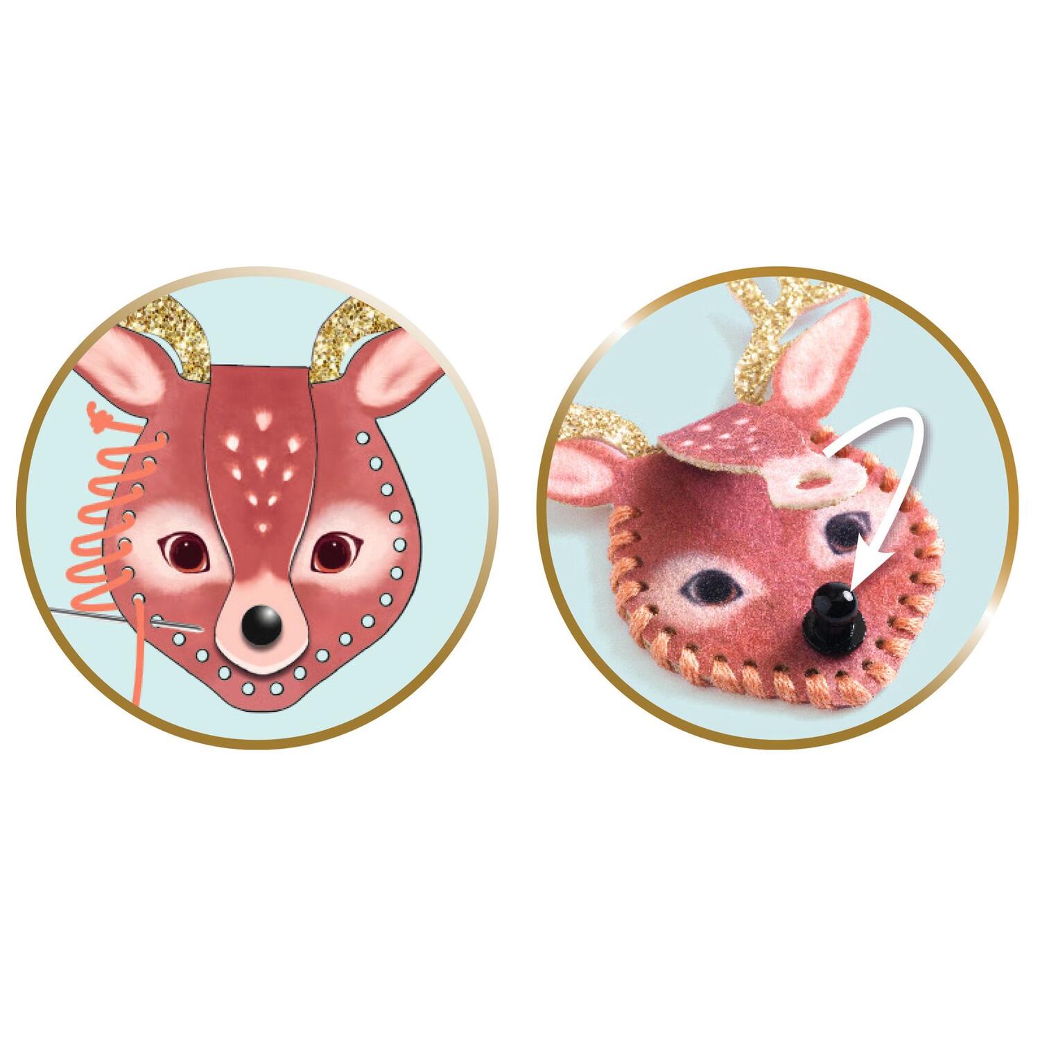 Finiture curate che combinano feltro opaco e glitterato, fili con riflessi metallizzati decorati con perline lucide e opache. Le istruzioni dettagliate guidano i bambini nella loro creazione.
