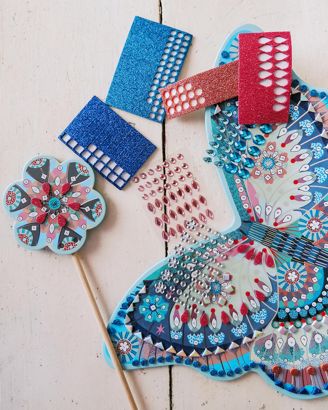 Mosaici adesivi glitterati e strass adesivi per un risultato scintillante.