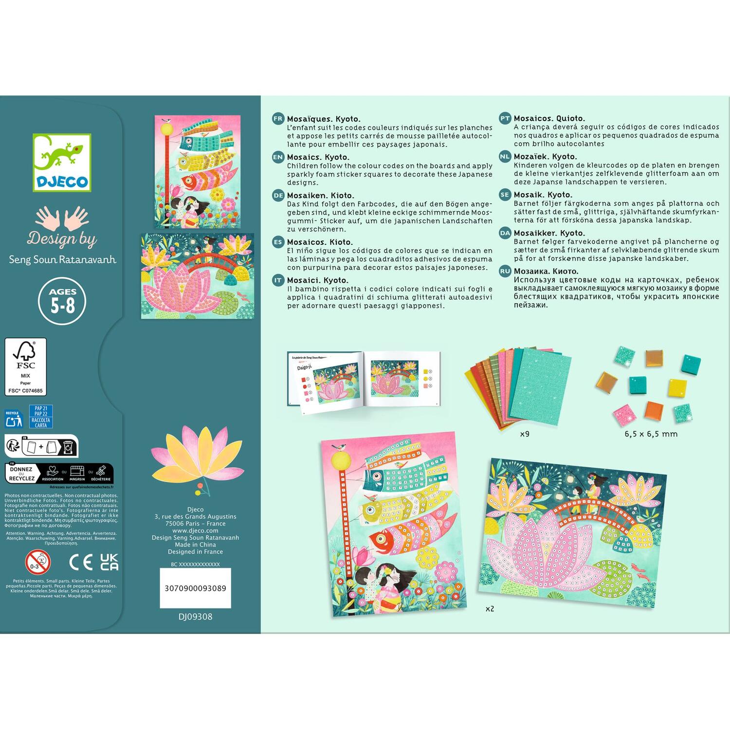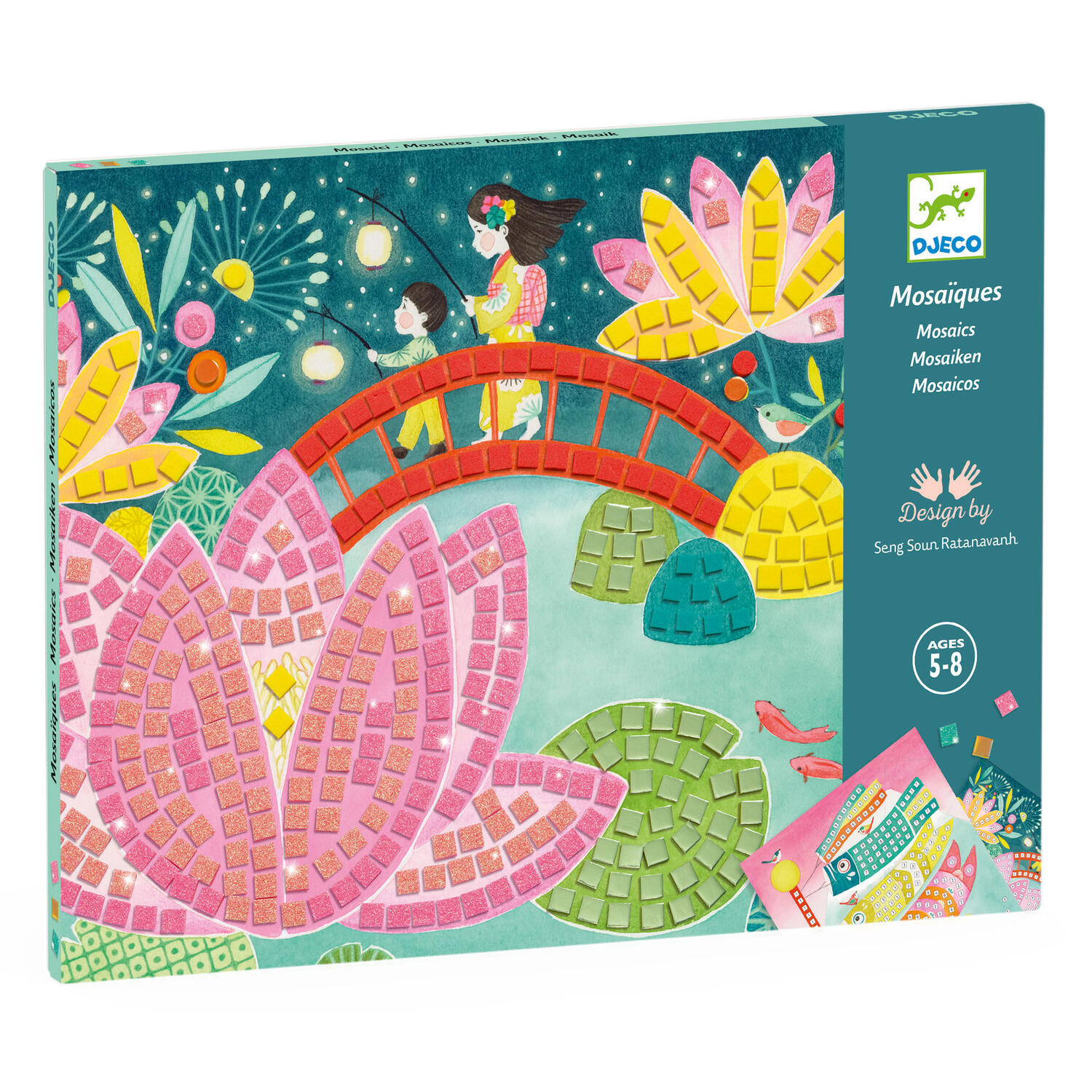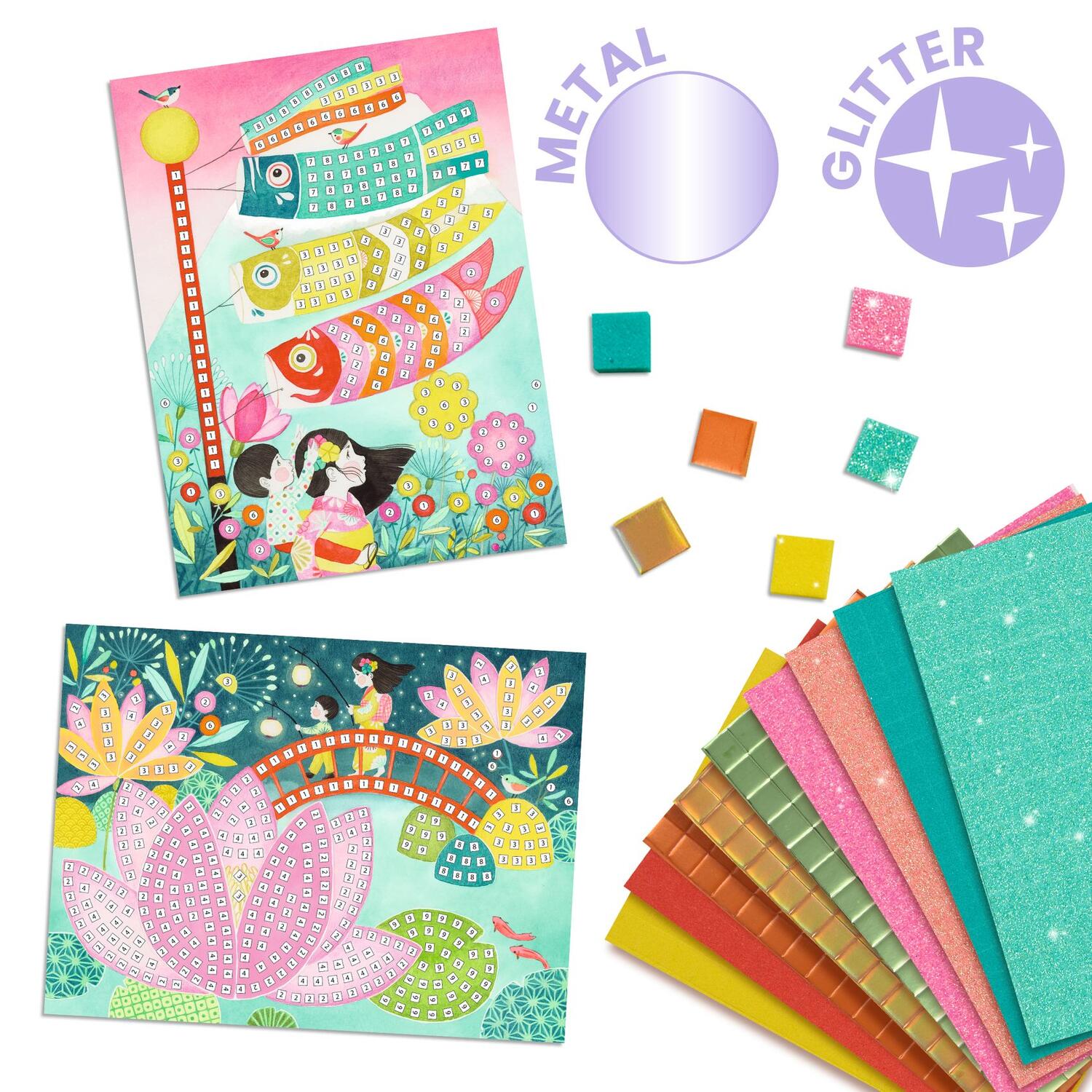 Un'attività di collage per creare immagini a mosaico. Per far brillare questi splendidi paesaggi giapponesi, il bambino completa i quadri con piccoli quadrati di schiuma adesiva e glitterata seguendo passo dopo passo le indicazioni del libretto. Un prodotto in carta e cartone certificato FSC®.