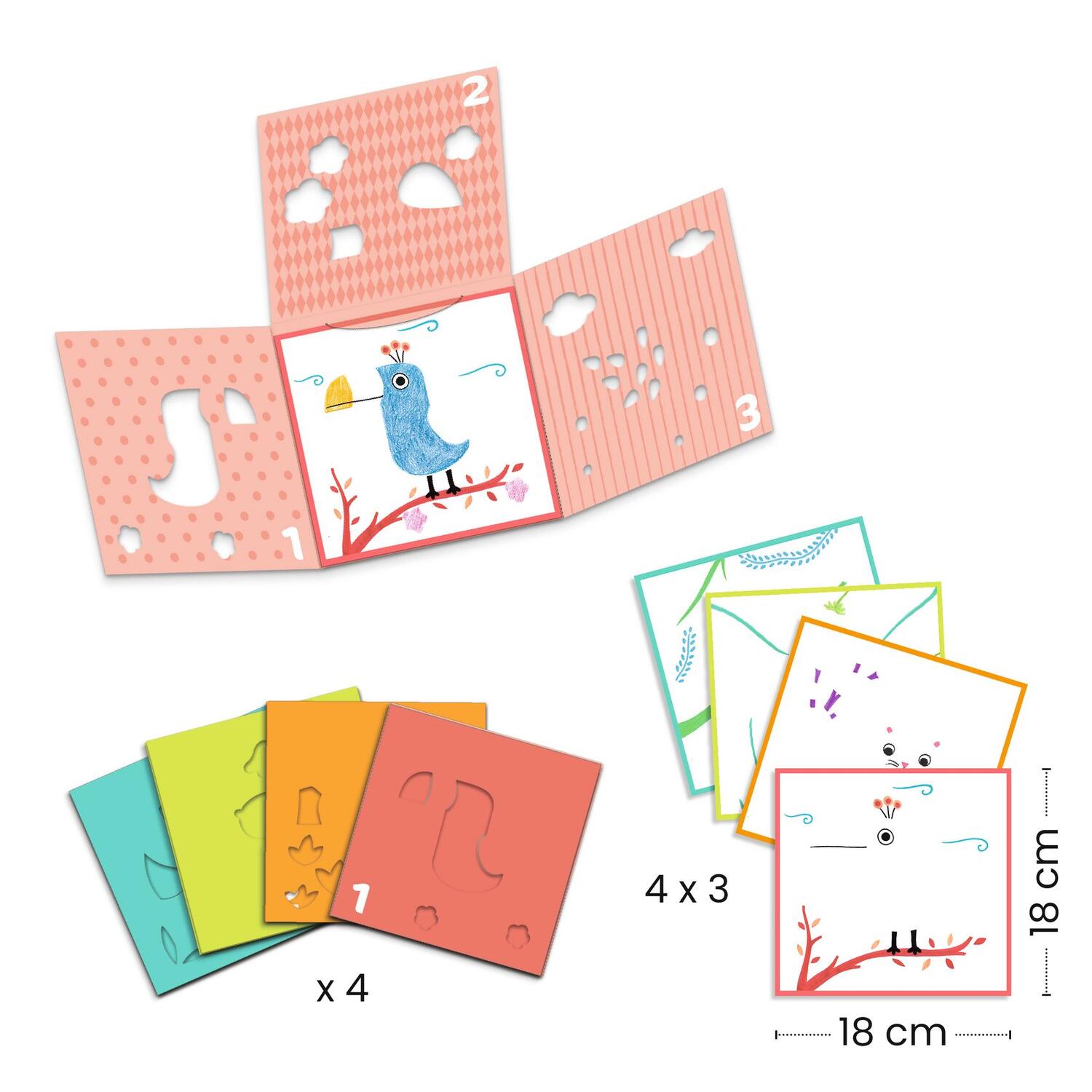 Il bambino crea il suo quadro utilizzando un unico stencil diviso in tre parti. Inserisce un foglio, poi ripiega il primo stencil. Colora. Apre e fa lo stesso con il secondo, poi con il terzo. Il risultato: una magnifica opera d'arte!