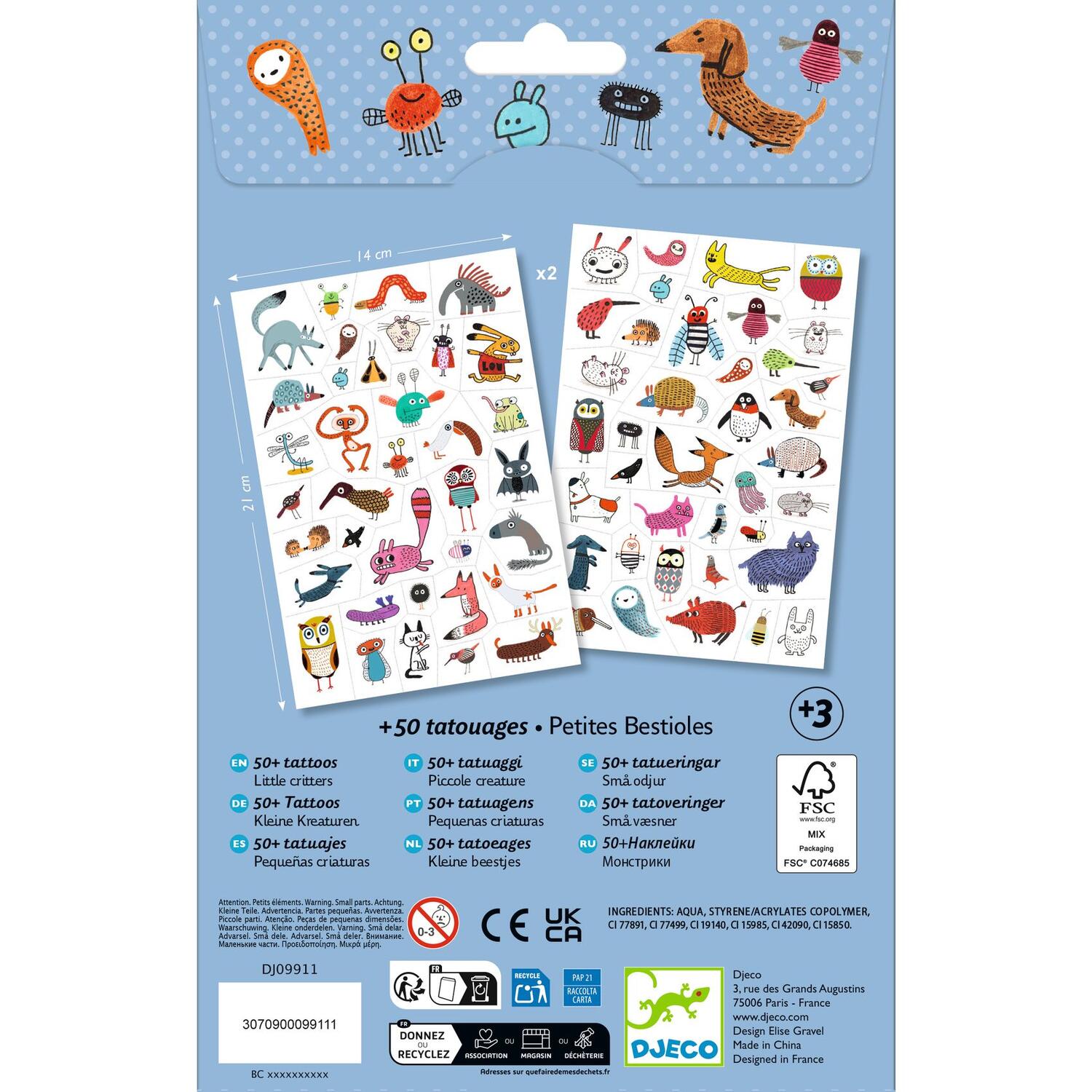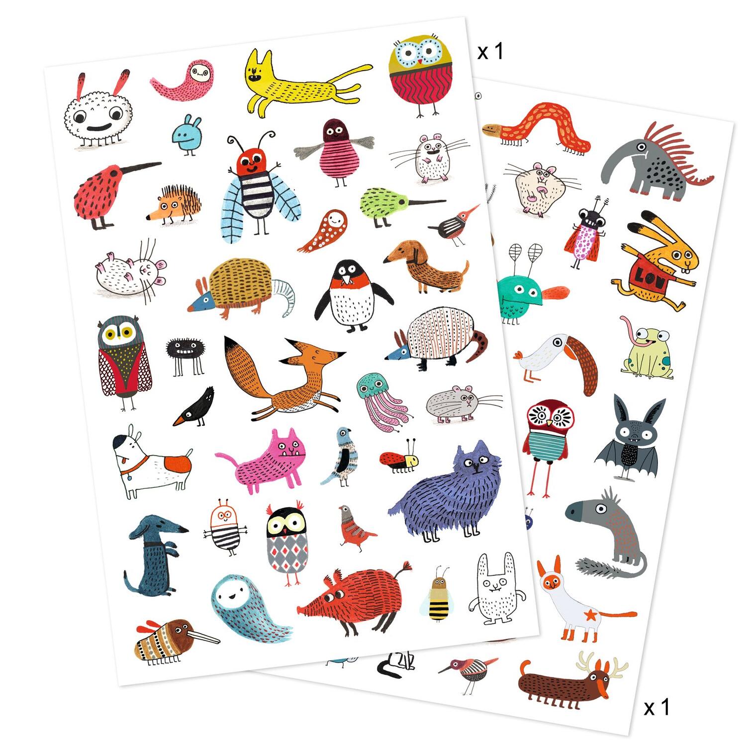 Due fogli di tatuaggi temporanei dermatologicamente testati. Facili da usare, sono pretagliati e si applicano con un po' d'acqua.