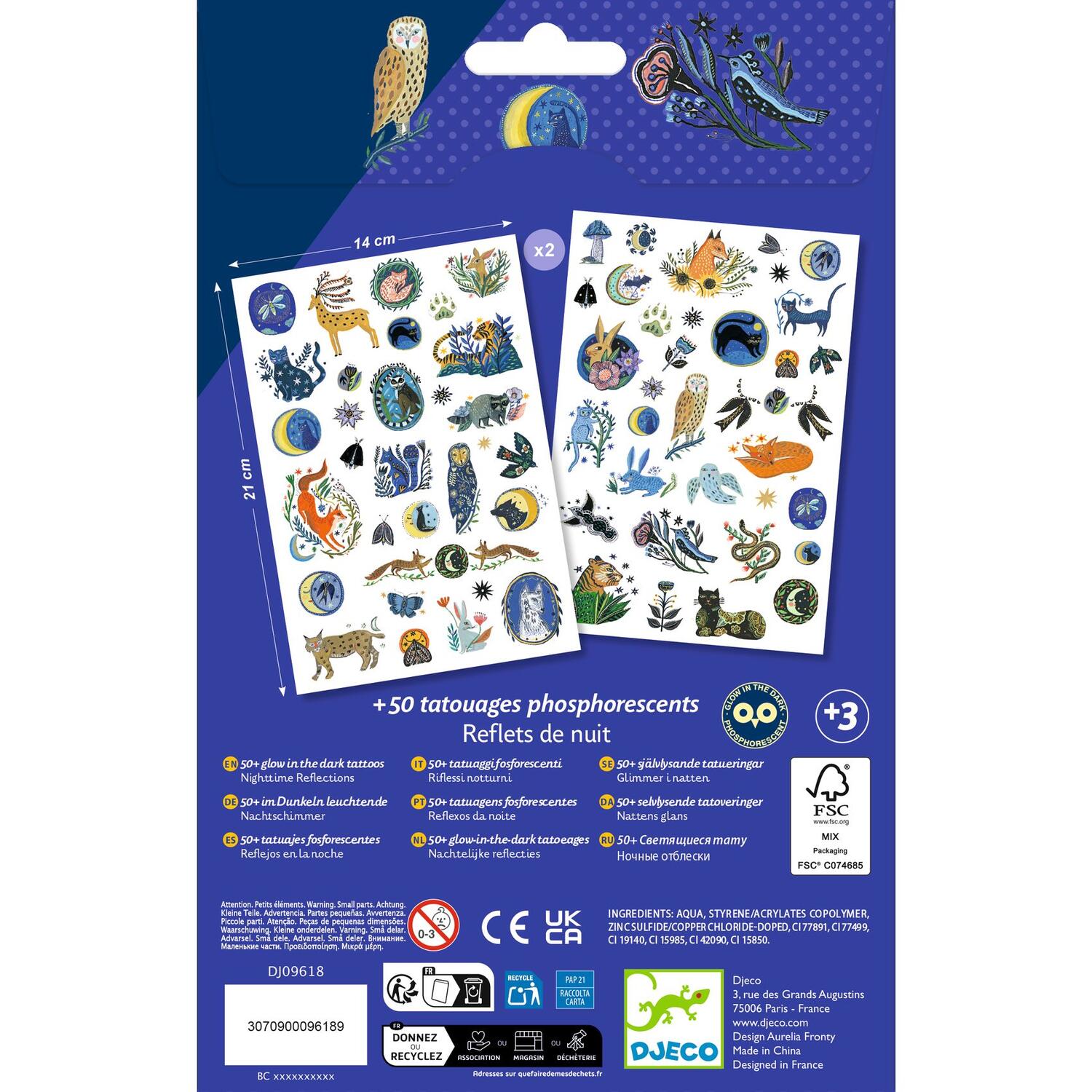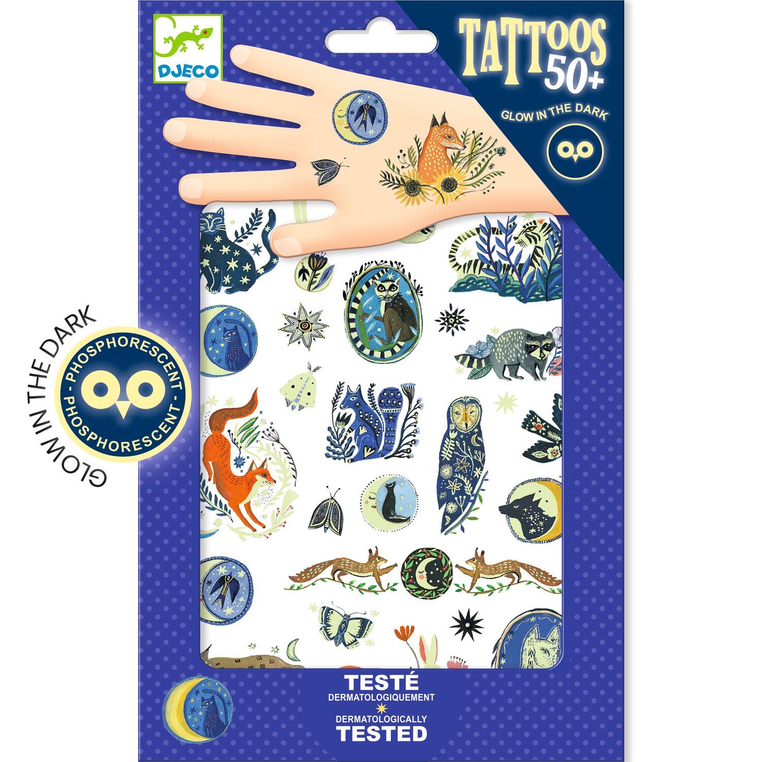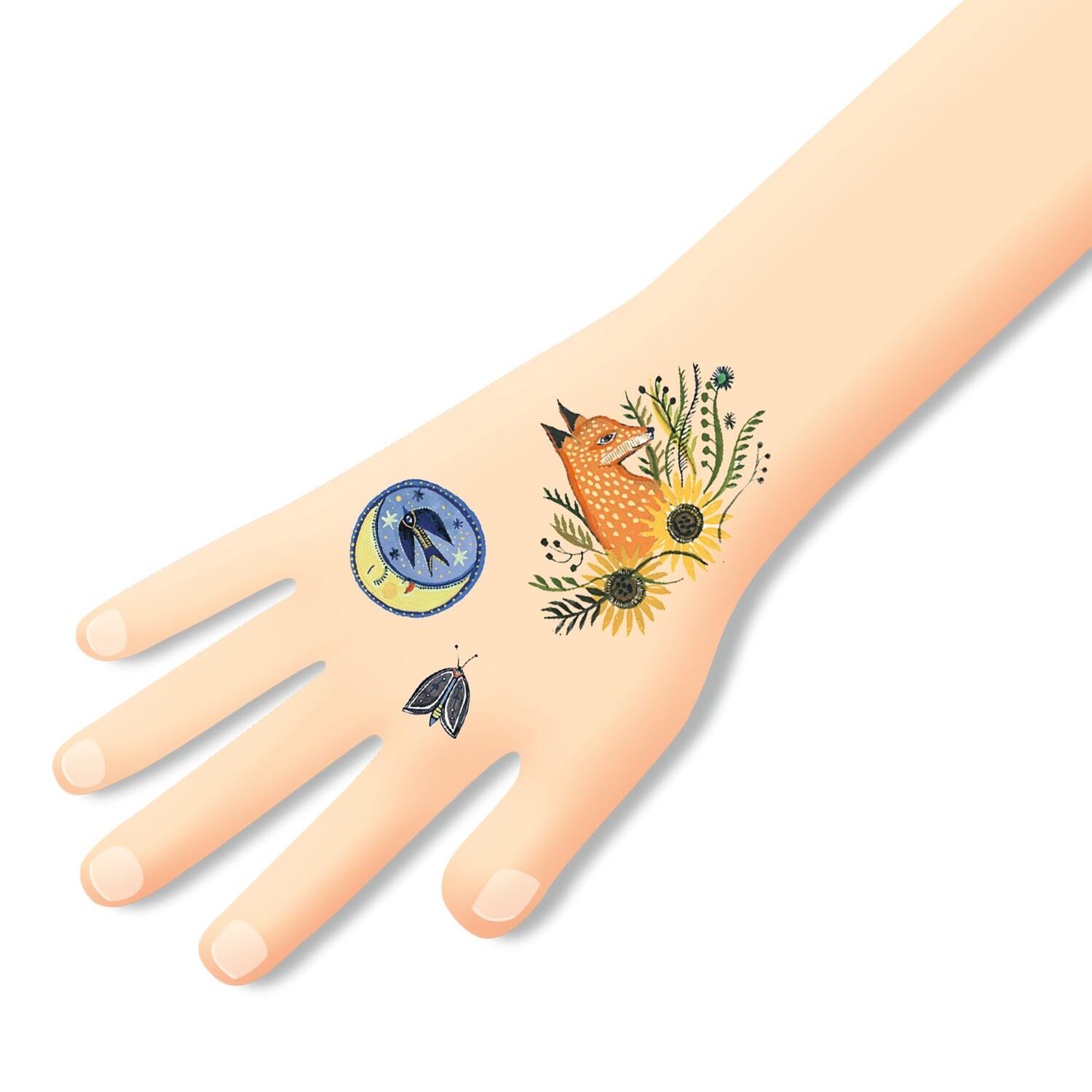 Due fogli di tatuaggi temporanei dermatologicamente testati. Facili da usare, sono pretagliati e si applicano con un po' d'acqua.
