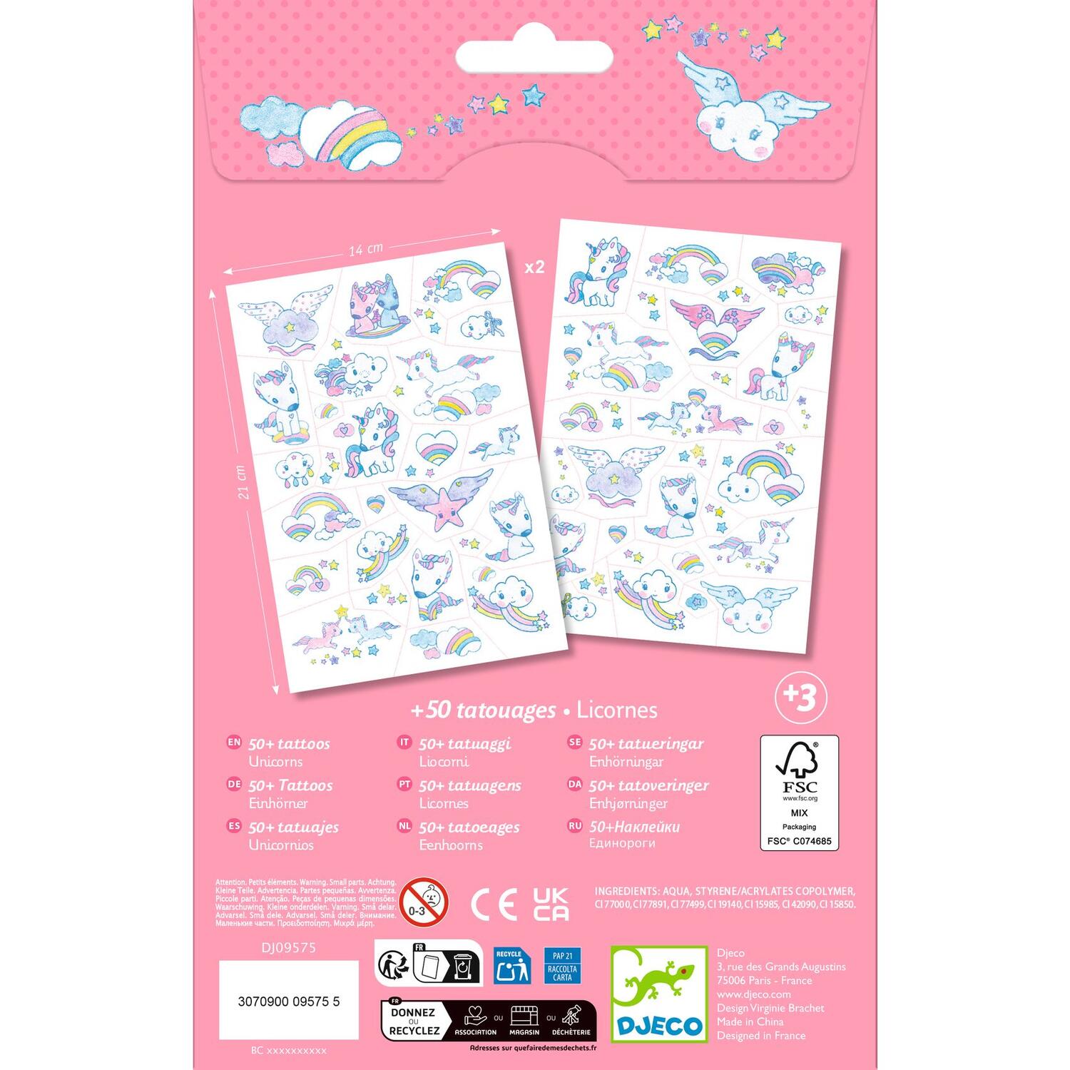 Due fogli di tatuaggi temporanei dermatologicamente testati. Facili da usare, sono pretagliati e si applicano con un po' d'acqua.