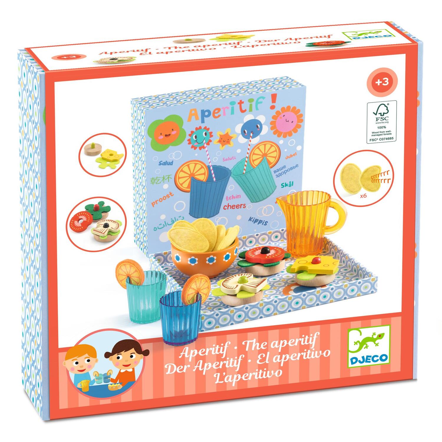È ora dell'aperitivo! In questa graziosa scatola di legno ci sono tutti gli accessori per preparare un aperitivo delizioso e festoso: il coperchio diventa un grazioso vassoio su cui il bambino può appoggiare e trasportare la ciotola di patatine, i 2 bicchieri da cocktail decorati con una fetta d'arancia, 3 deliziosi dolcetti da comporre con 6 ingredienti e una caraffa. All'interno delle patatine, un foglio di carta frusciante per un suono “croccante”. Una volta che tutto è pronto, non resta che brindare e gustare! Cin cin!