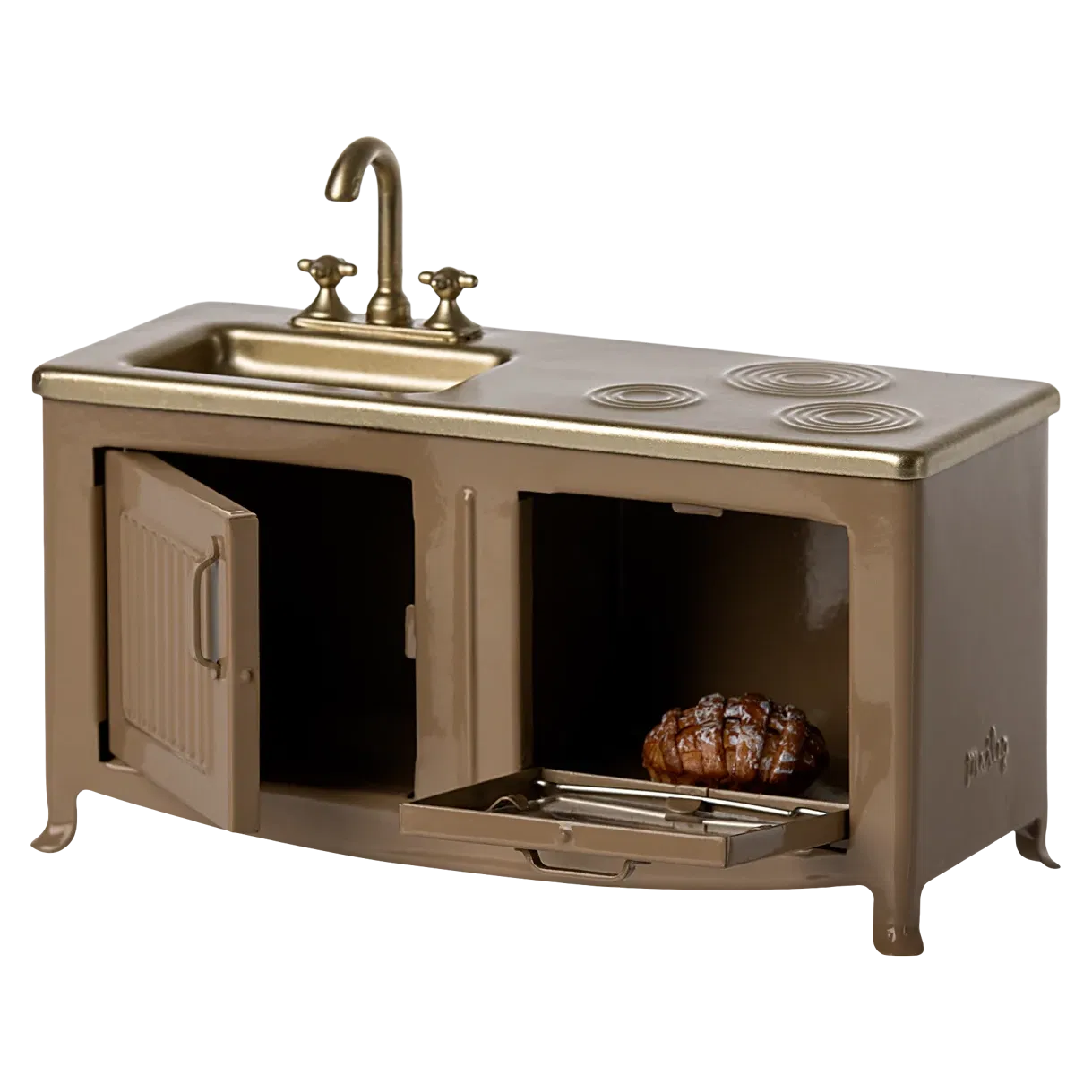 Il cuore di ogni casa è la cucina. Questa cucina in metallo ha una bella tonalità e molti dettagli giocosi come l'anta dell'armadio, il lavello e il forno con una torta appena sfornata. È perfettamente dimensionata per la famiglia topo.