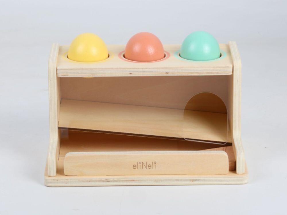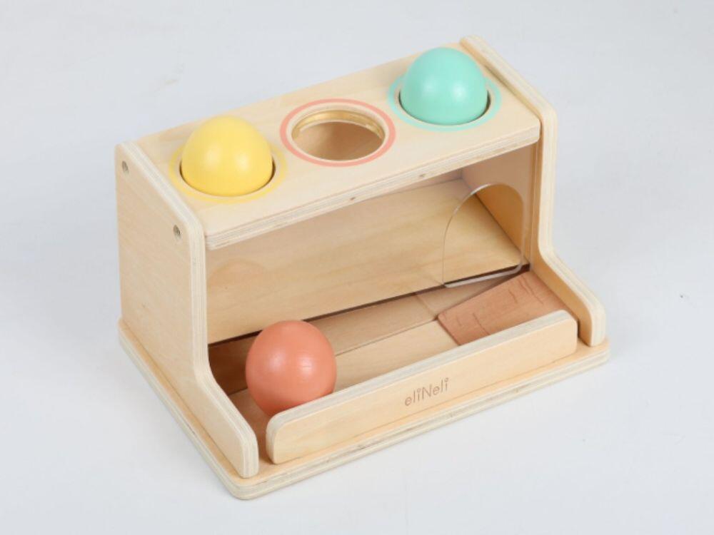 Sulla parte superiore della scatola ci sono tre palline colorate in tenui tonalità pastello. Ogni biglia è tenuta saldamente nel foro da una guarnizione in gomma flessibile e i bambini devono esercitare una leggera pressione per spingerla verso il basso. Questo movimento rafforza le dita dei bambini e insegna loro la pazienza. Quando vengono premute, le biglie scendono attraverso la parte trasparente della scatola, quindi è possibile seguire il loro percorso fino a quando non appaiono sul fondo. Questo elemento visivo rende il gioco ancora più divertente e stimola la curiosità e la comprensione del principio di causa ed effetto.