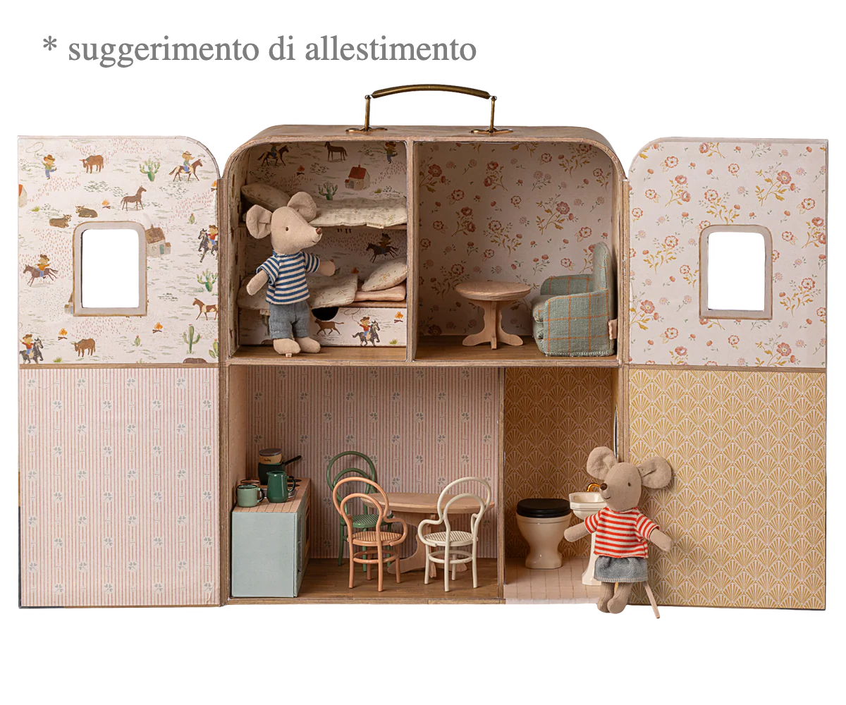 Benvenuti a SuitCasa, una piccola casa portatile in robusto cartone riccamente decorato. È adatta alle dimensioni sorellina e fratellino. Sono inclusi 2 set di morbida biancheria da letto per i vostri amici, ma potete acquistare diversi altri piccoli mobili per arredare la casa.