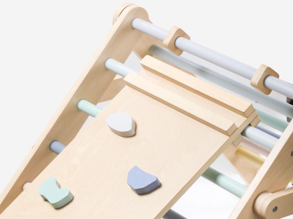 Set evolutivo con struttura per arrampicata a forma di triangolo - il Pickler Triangle, un ausilio per arrampicarsi, gattonare e strisciare e, per la maggiore sicurezza dei vostri bambini, è dotato di un blocco di sicurezza per impedire la chiusura accidentale e di una tavola doppia 2in1 (scivolo e parete da arrampicata con maniglie) che si fissa molto facilmente alla struttura per arrampicata (triangolo). Basta agganciarlo a qualsiasi piolo (eccetto quello più alto) e avrete creato un divertente parco giochi per i vostri bambini e i loro amici. Un parco giochi dove i bambini possono non solo arrampicarsi sulle scale, ma anche scalare la parete da arrampicata o scivolare. La tavola è inoltre dotata di una guida terminale che consente di collegare il triangolo Pickler al dondolo Montessori e alle altalene in legno eliNeli. I bambini più piccoli adoreranno lo scivolo, la cui pendenza può essere regolata in base all'età e al coraggio del bambino, mentre i bambini più grandi si divertiranno di più ad arrampicarsi sulla parete da arrampicata.